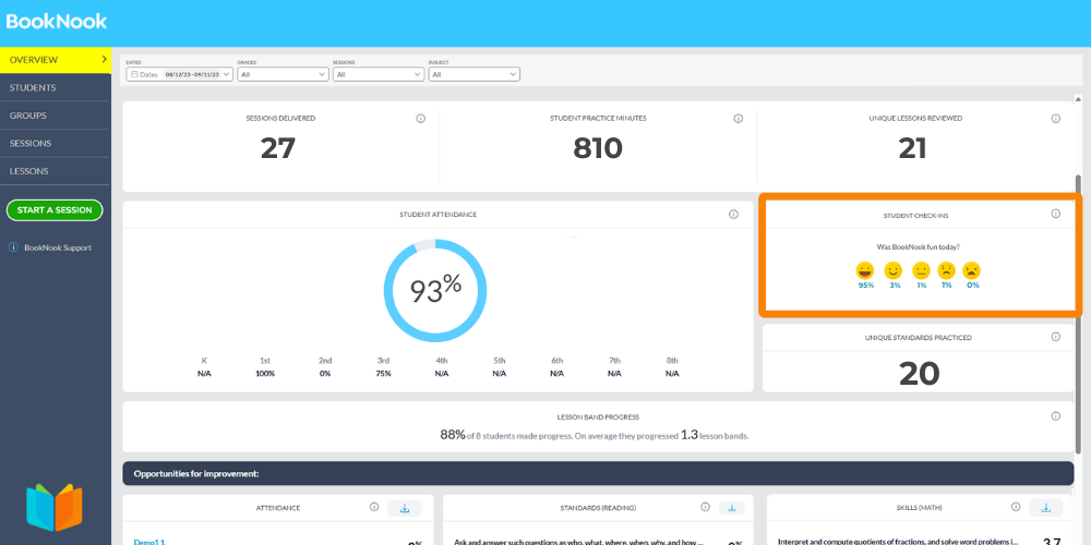 The Student Emoji Check-Ins tile on the BookNook Dashboard home page has been expanded to include student responses from Reading and Math sessions. What’s new:
